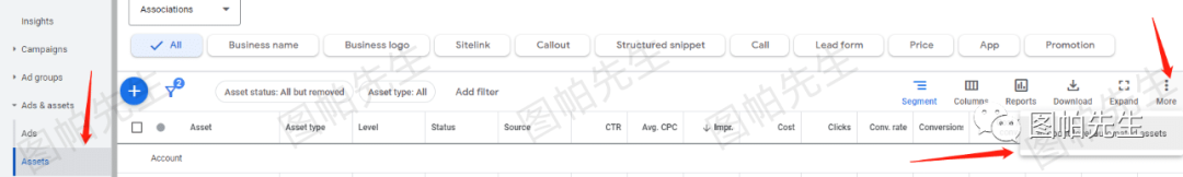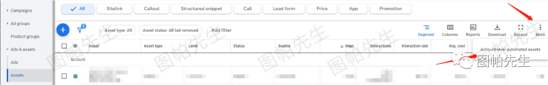 进入谷歌搜索广告中的assets(不是Pmax的assets),报表的右上角有个more,点击Account-level automated assets