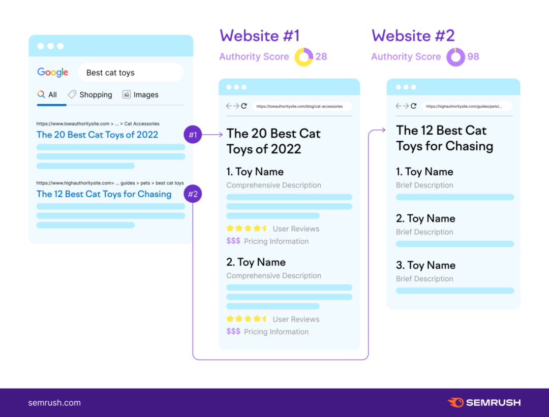 Google认为任何能满足用户搜索意图的页面内容都是”高质量内容”。举个例子,假设用户搜索的是”最好的猫咪玩具”。许多网站都有相关的信息。