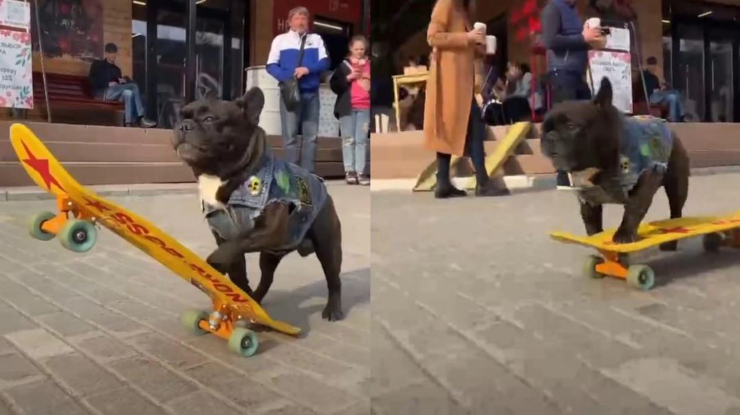 一只身穿潮流“牛仔外套”的小法斗,在主人的指挥下,踏上了黄色轻巧滑板,一条小短腿在板下一步一滑,向前方冲去。