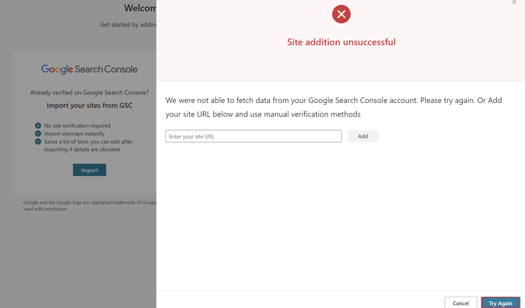 但等等,总有同学会碰到这个失败的情况!如果显示失败也没有关系,点击 Try again 重新尝试几次,如果再不行的话你可以选择关闭页面,你会发现已经全部导入了所有的站点,但可能站点地图sitemap没有被成功导入(微软的同步bug),在下面我们会讲到。