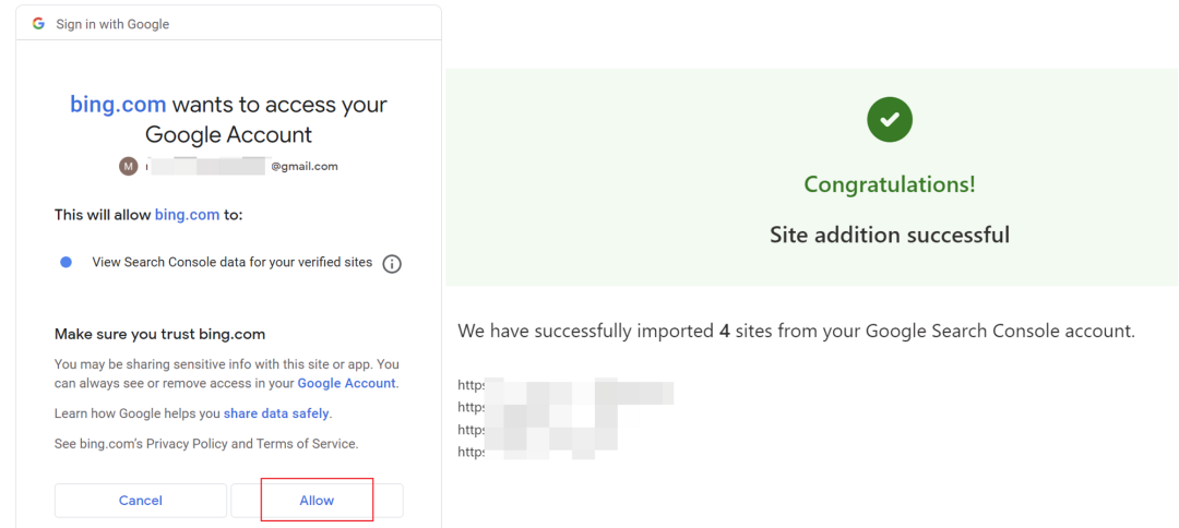 登陆完成之后,请务必选择左边的”import your sites from GSC”,点击Import,follow必应告诉你的步骤。当然,如果你没有绑定谷歌账号的话,选择右边的手动添加site也是可以的,只需要简单地在首页HTML中添加meta标签即可。