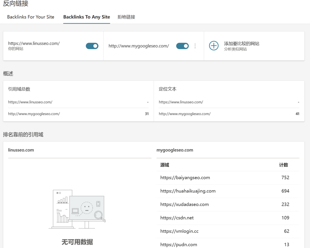 但注意,这里有一个”Backlinks To Any Site”,可以对比其他网站的链接!这里我悄咪咪拿了若凡SEO的网站对比,很明显我是一个新站点(刚刚建设好),但是我可以瞄到很多关键的信息,比如我可以到白杨SEO、徐大大SEO去蹭友情链接,这些在我们独立站SEO中就很有可能是非常重要的竞争点:
