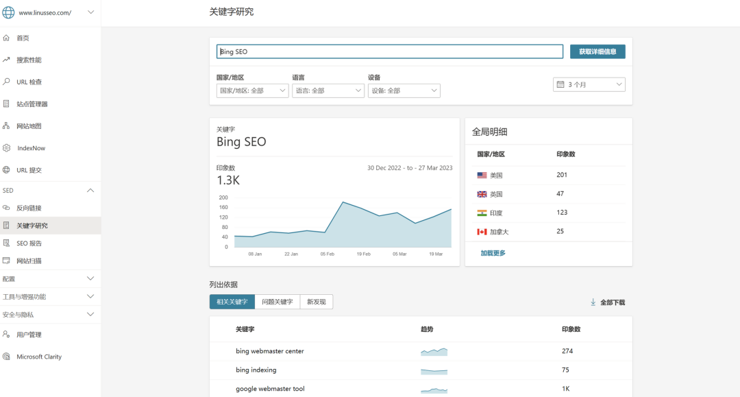 这个功能相当于谷歌的关键词规划师,用起来如丝般顺滑,很明显从二月开始,Bing SEO也开始上升了不少搜索量。并且在下方,你可以关注到非常多的属于Bing的长尾词,对于SEOer来说,从不同的地方获取关键词灵感是非常重要的。