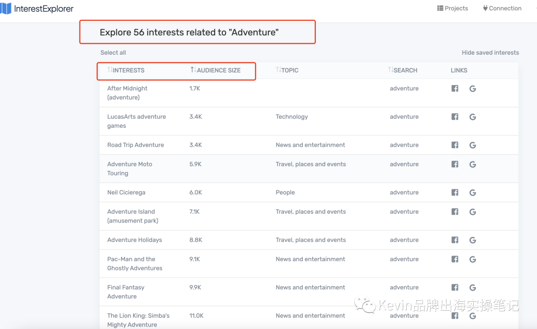 比如输入一个adventure受众,interest explorer会推荐56个同类型的受众群体,远远大于facebook系统推荐的25个。而且 facebook是给上百万个商家推荐相同的25个受众。fb推荐的受众群体竞争很大的。通过一些fb受众发掘工具,可以寻找一些隐藏的fb受众。降低获取流量的成本。