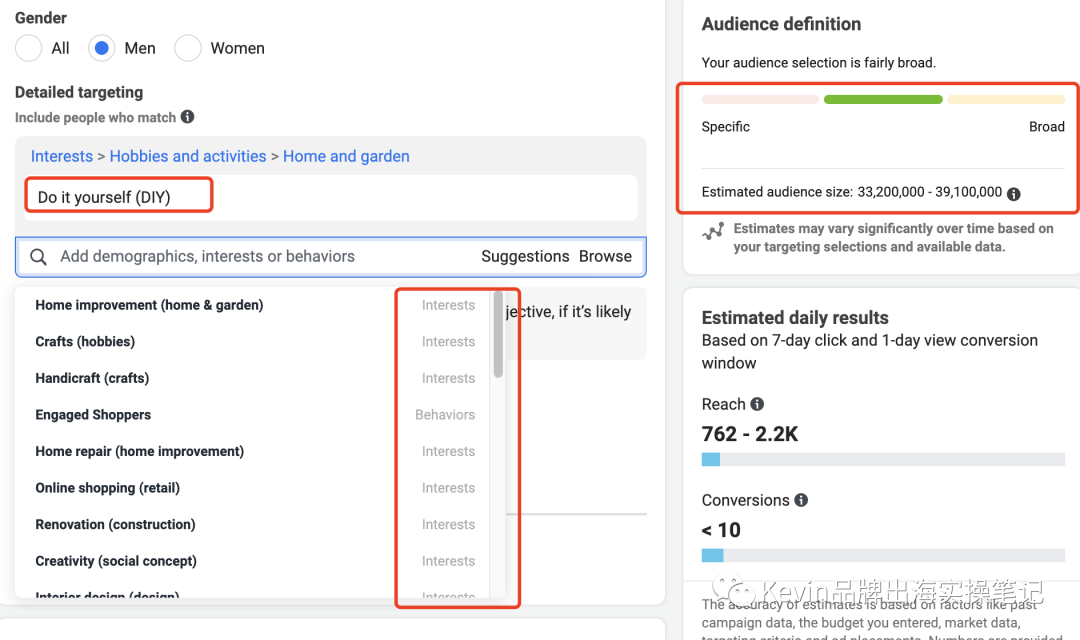 比如输入 diy,fb系统会显示这个diy人群规模,同时推荐25个和diy相关的其它受众群体。