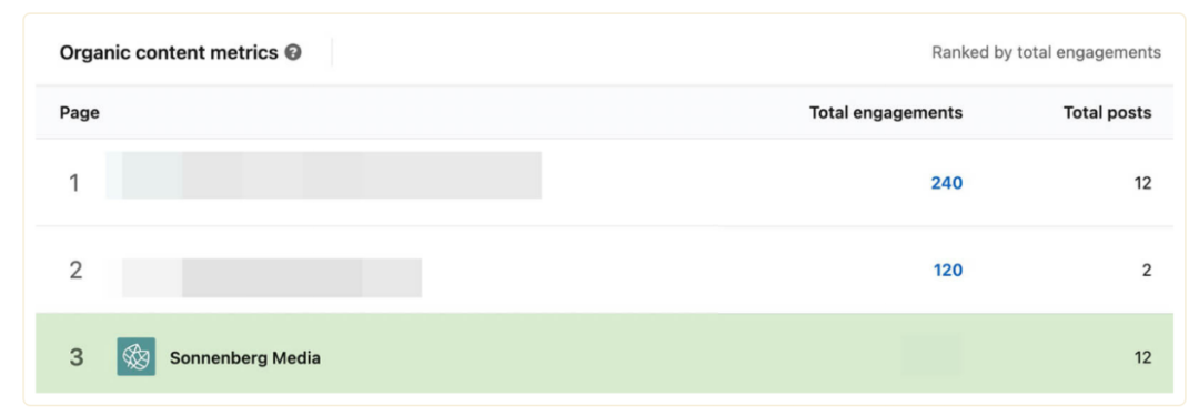 领英会自动将你的公司主页与你的竞争对手进行比较,集中在关注数量和有机内容两方面,并以表格形式呈现,以便你能了解快速吸粉并维持高参与度的公司有哪些。
