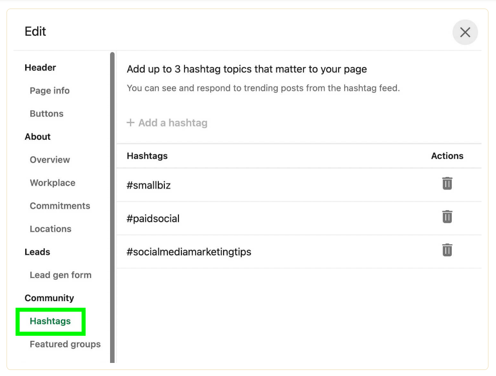 公司主页可添加最多三个标签。具体步骤如下:访问公司主页——点击“编辑页面”(Edit Page)——点击”标签”(Hashtags,最多添加三个关键词)。