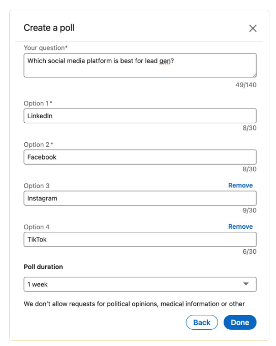 投票功能和发布动态一样,可填写一个标题。例如,你可以添加上下文或鼓励关注者写下选择该选项的理由。