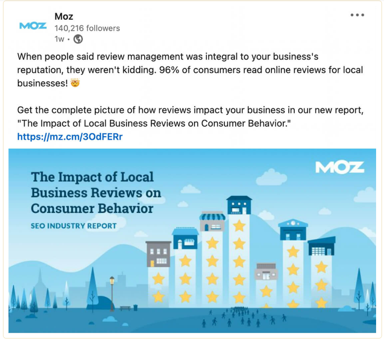 例如,Moz发文介绍了关于SEO平台的原创研究,这篇帖子分享了一个重大发现,吸引了很多关注者参与讨论,同时这篇帖子还建议潜在客户点击链接进入网站原文了解更多信息。