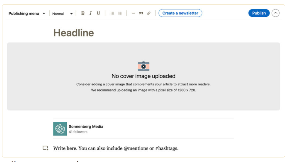 另一种方式是发布领英文章,字符数量允许超过100,000个。领英文章可添加媒体、提及(@)和外部链接,让你分享更深入的见解,发挥思想领袖的作用。