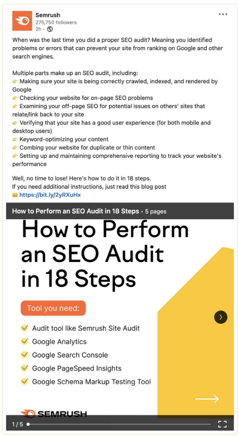 例如,你可以发布Q&A相关文章链接,或者分享独家指南和报告的链接。举例来说,Semrush发布了一份关于执行SEO审计的文档,关注者可以滚动浏览该文件。如需了解更多细节,他们可以点击帖子中的链接来访问完整的资源。