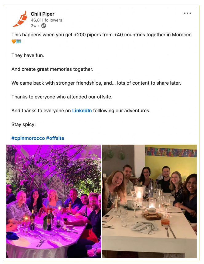 例如,Chili Piper将分享公司文化作为领英内容的关键部分,在公司主页定期分享举办的员工活动,向关注者介绍品牌背后的员工。在下面的帖子中,Chili Piper分享了一张场外活动的照片,标记了几十名团队成员,收获了大量的互动。