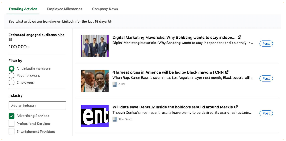 然后通过选择行业、工作职能和资历级别等条件来过滤文章。点击文章旁边的发布(Post)按钮,添加标题可立即分享内容。