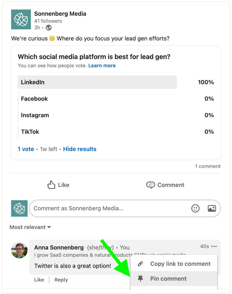 寻找客户关注的行业协会和佼佼者,然后以公司的身份在他们的帖子下评论。如需以公司身份进行互动,点击帖子下的个人资料图标,在列表中选择公司。