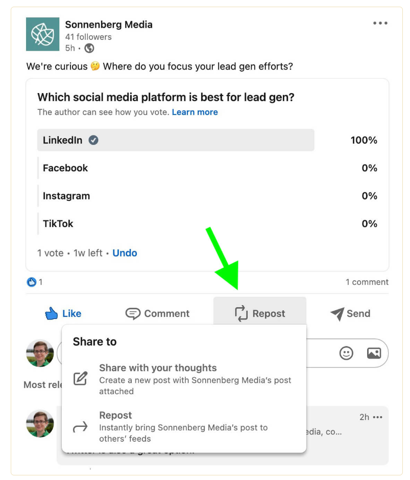 想要吸引公司主页关注者之外的潜在客户,最简单的方式是将公司内容分享到你的个人主页。如果你的关注者与公司目标市场重叠,这将起到很大的帮助。点击公司主页帖子下方的转发(Repost)按钮,直接分享到你的个人主页,或添加自定义标题后转发。
