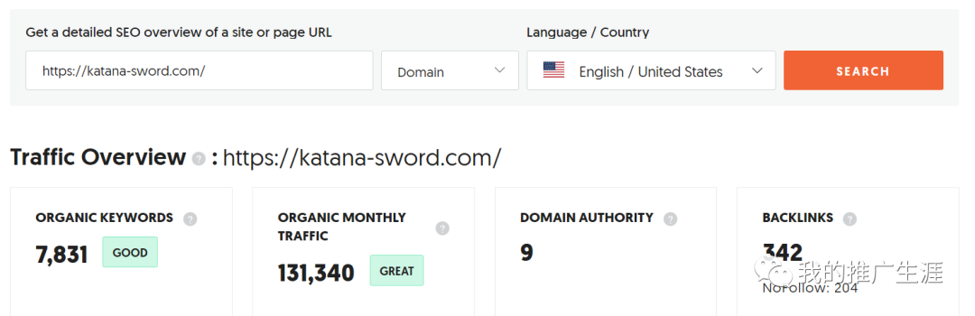 这个网站是卖武士刀的,这类的产品售价都不便宜,网站建站时间是2021年搭建的,上个月从谷歌获得了13万左右的自然访客,平均每天有4000左右的访客人次,这个流量是很不错的。
