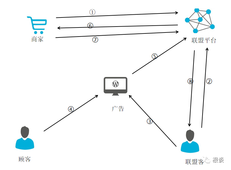 由于一些的推广行为都是在网络上完成,广告主需要追踪哪些订单是由哪些会员推广带来的,因此需要追踪技术,于是整个环节需要另外的参与者:联盟平台