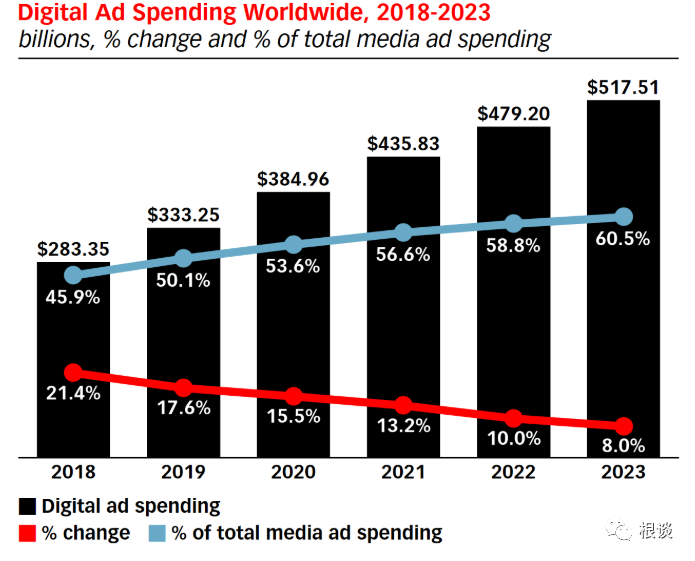 通过下面这张图大家都知道,整个全球互联网数字广告的预算花费是逐年上升的,主要原因是互联网的快速发展,很多传统线下广告的预算逐步往线上迁移。但是根本原因还是互联网广告技术的发展使得各种广告追踪升级和效果监测变得越来越透明化。