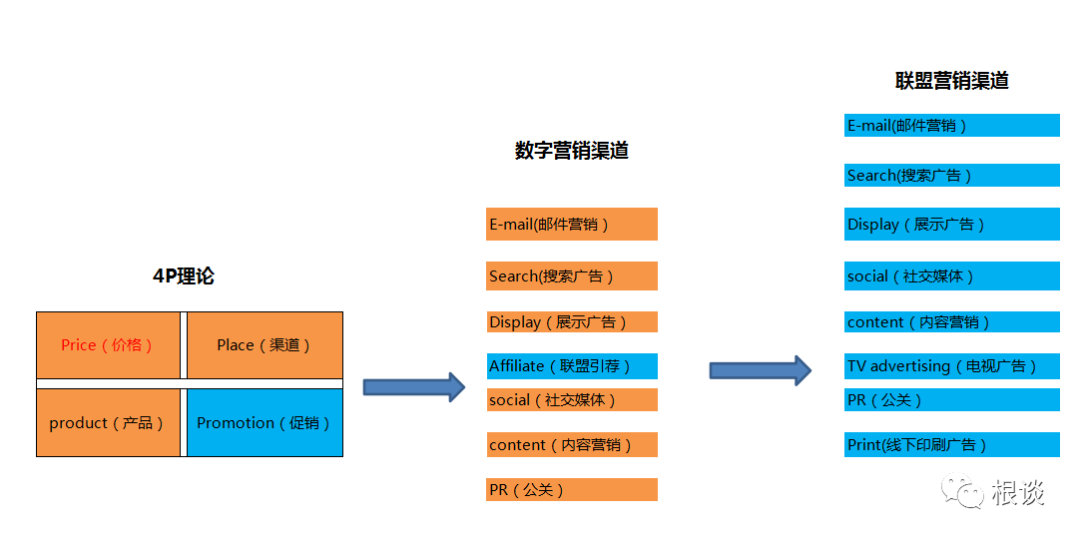 而市面上关于独立站所做的引流推广都在Promotion的范畴,不管是站内的还是站外的Promotion数字营销渠道常见的有E-mail(邮件营销),Search(搜索广告),Display(展示广告),Affiliate(联盟引荐),social(社交媒体),content(内容营销),PR(公关营销),而我们常说的Affiliate所用的推广引流方式,也是基于这几种进行组合的,从这里看出,联盟营销其实就是小型的全套数字营销,通过affiliate marketing的形式来到达到marketing mix。