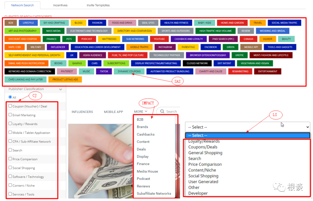 首先我们来看看各大主流联盟平台的分类,截图中红色标记的就是SAS,CJ,IMPACT和LS的联盟客归类,每个平台似乎都有自己的一套划分的标准,导致结果不尽相同。下面我会综合各个平台的共同点以及经验来归纳出常见的联盟客类型。