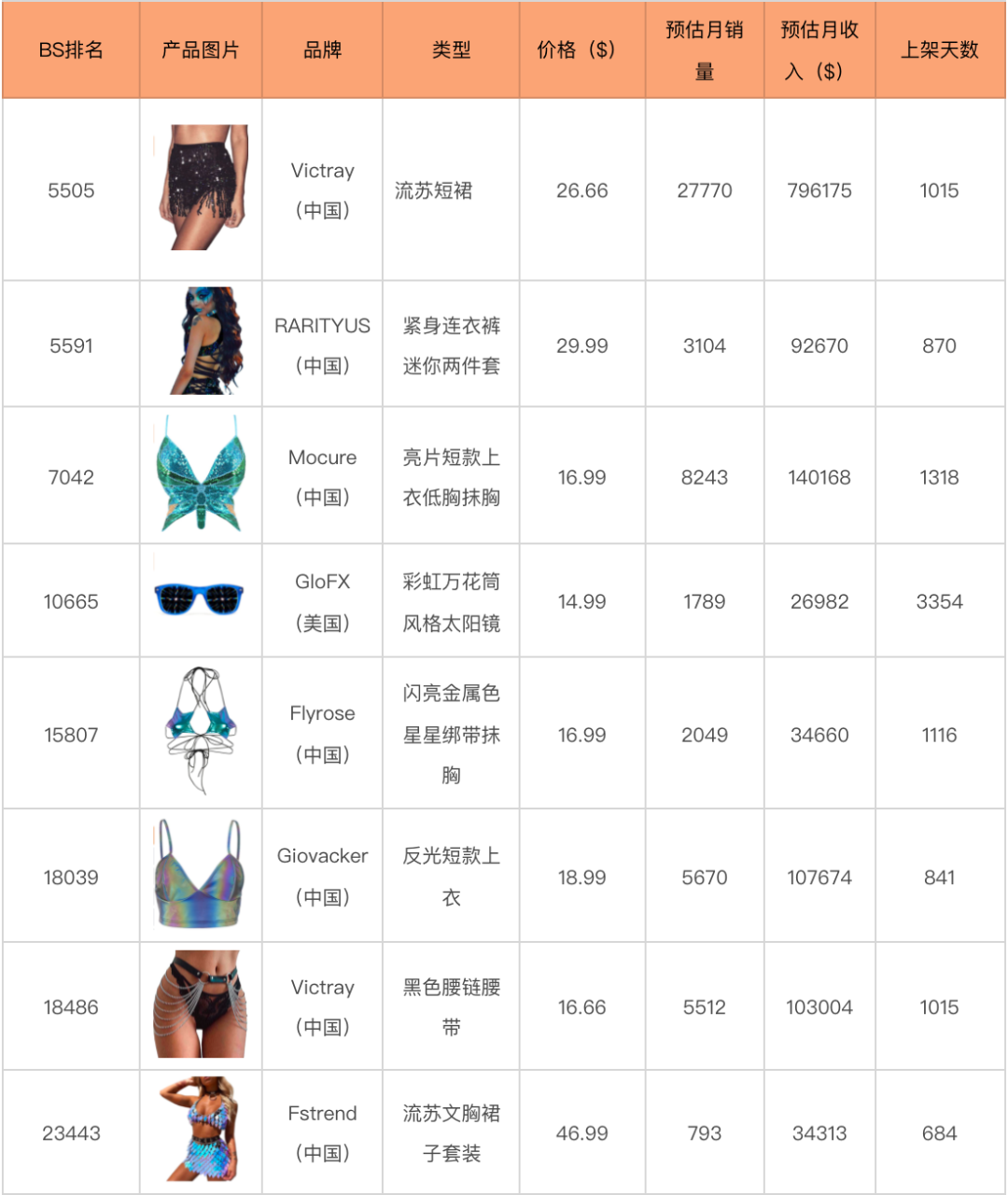 下图是亚马逊上电音服饰排名前十的Best Seller的详细数据。