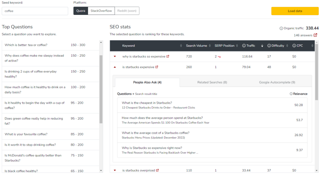 比如,当我去搜索“coffee”这个词根时,你会发现在问答社区上会有一大堆与关键词相关的问题,且这些问题的搜索量并不小,但是竞争难度并不是很高。